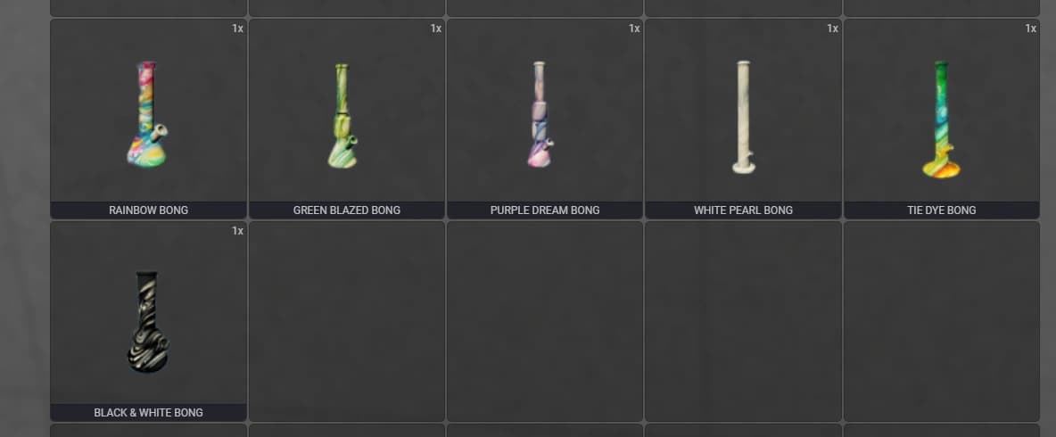 - 6 custom bongs props that are ready to use with selectable weed baggies.